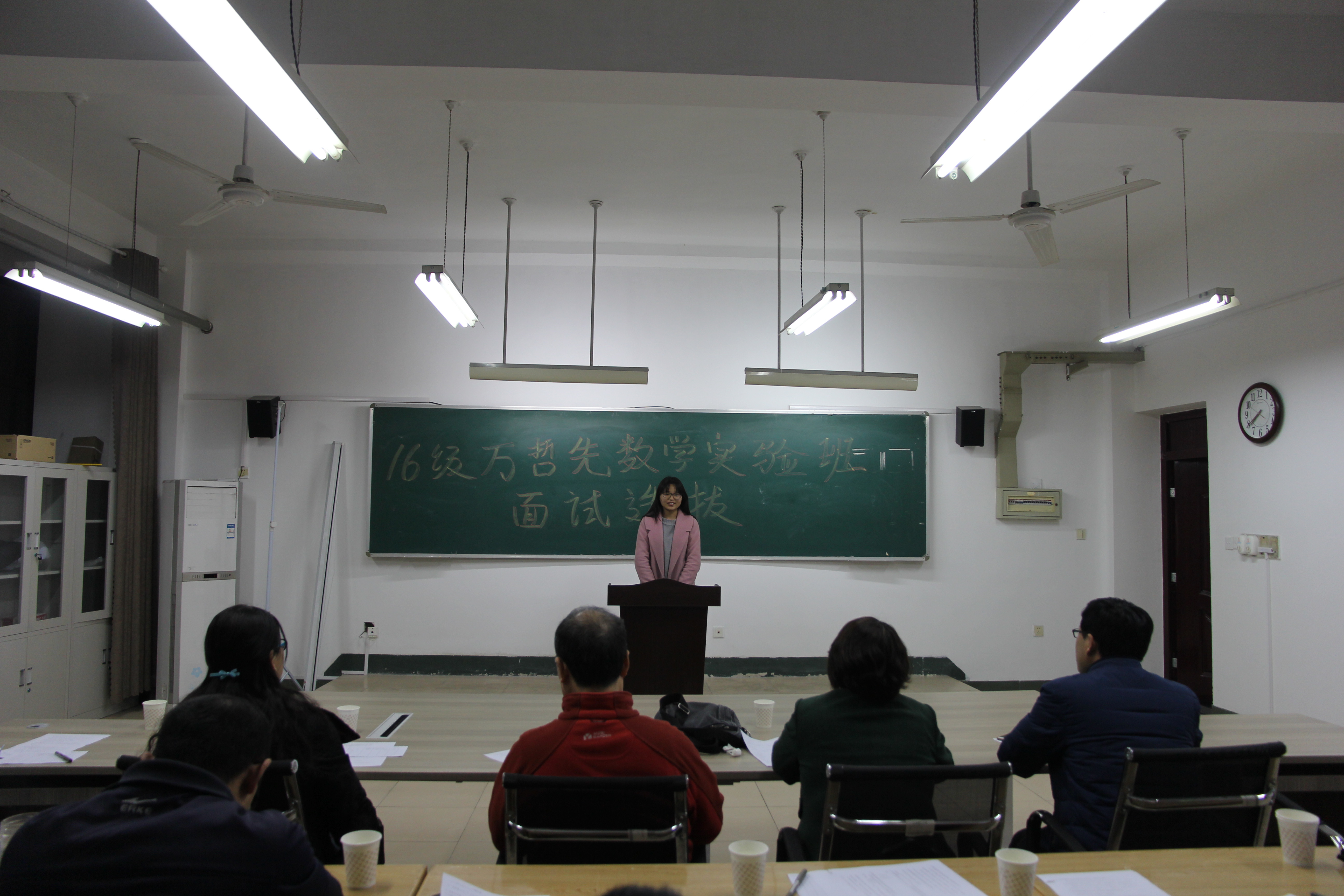 选拔于七点开始,同学们提前进行抽签,面试共分自我叙述、专业知识、自由问答三个阶段,选手有五分钟时间作答,评分采用百分制,由评委现场打出对应分值,经学生代表核算选手最终面试得分。这次的匿名选拔做到了公开、公平、公正,很好地检验了同学们的真实水平,也能从中找出学习中的疏漏。面试过程中同学们精力集中、冷静沉着,能够运用所学知识快速解答题目,评委老师们言语亲和幽默,又能一语中的,引导同学更好地思考问题,对于同学们今后的学习和发展也给出了良好的建议。据了解,我校设立的“万哲先”数学实验班,采用“虚拟班”的培养模式,主要由教务处统筹协调,理学院承担有关培养任务和日常管理工作,意在培养学生现代数学思维和终身学习意识,提高学生利用数学解决实际问题的能力,同时提升学生的人文素质和科学素养,使其逐步成长为数学学科及相关学科领域的优秀人才。此次录取结果将在近期公布。