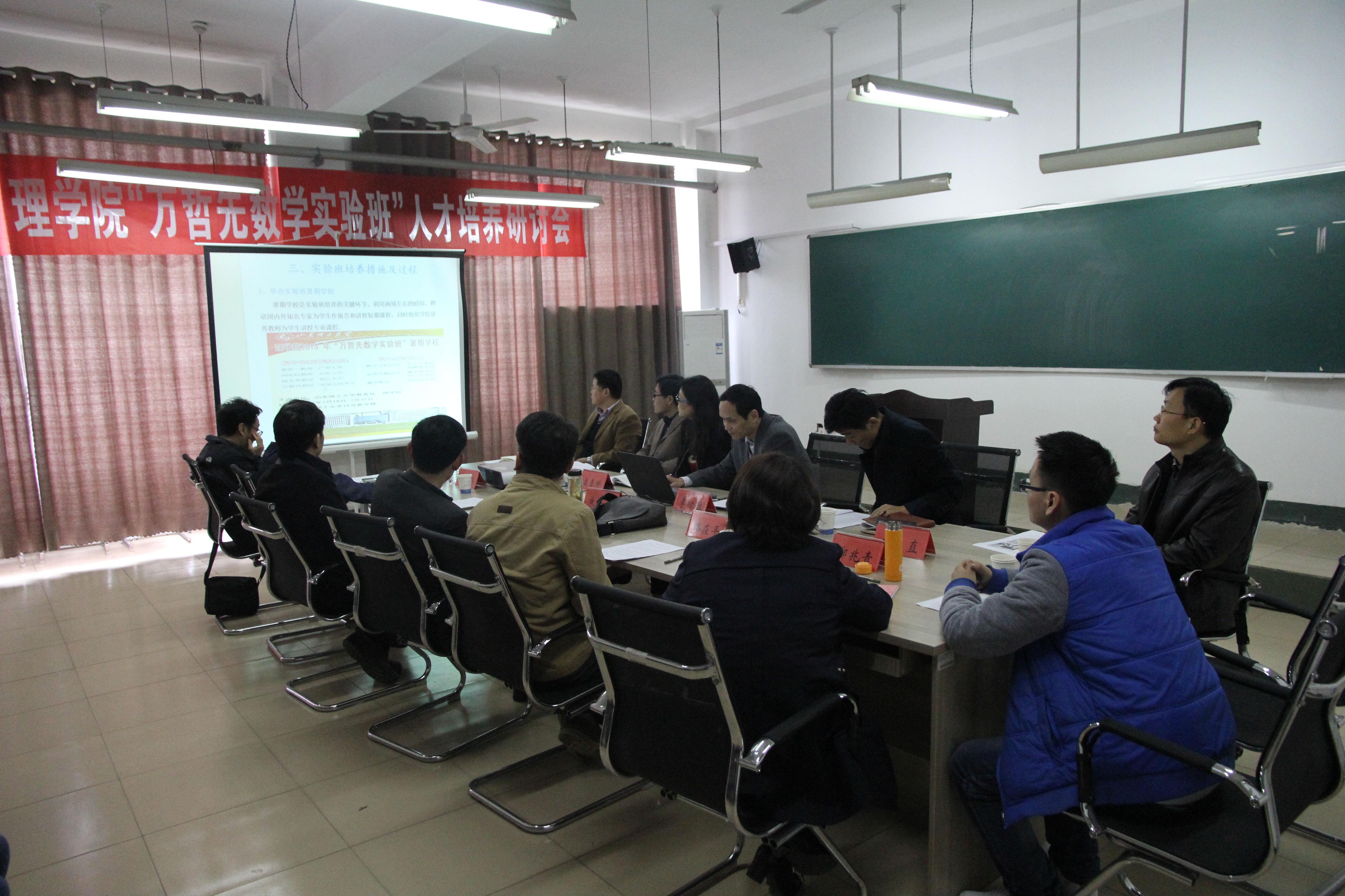 会上,理学院院长 李功胜教授介绍了实验班的培养模式和运行情况,并对首届实验班学生在在参加学科竞赛、学术论文发表、奖学金获得以及研究生入学考试等方面取得显著成果做中期总结汇报;实验班班主任 王贵栋老师介绍了实验班的管理和教学情况,著名数学家、中国科学院院士、我校特聘教授万哲先院士以视频的形式,在如何学好数学方面给出了指导性建议。与会专家学者从实验班学生选拔标准、如何做好实验班人才培养工作等方面进行了充分研讨,为下一步实验班的建设提出了很多中肯的意见建议。副校长魏修亭做了总结讲话,对与会专家表示感谢,对理学院做法予以肯定,指出今后万哲先数学实验班在培养模式上进行的大胆探索,起到了通过培养拔尖人才带动整体学风建设的良好作用,具有推广借鉴价值,学校将大力支持万哲先数学实验班下一步的建设。