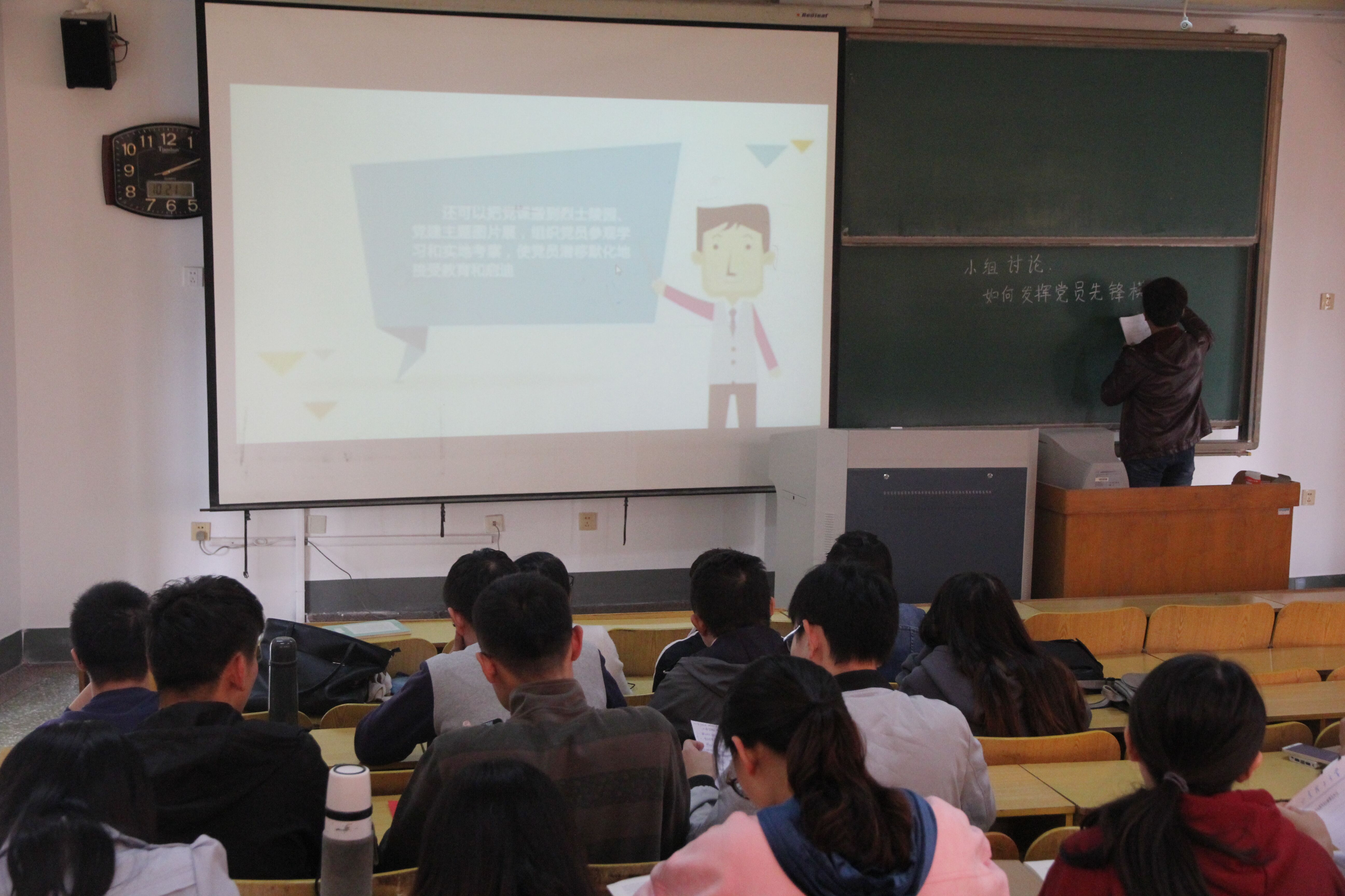 首先,王超带领大家观看学习“两学一做”系列微课,通过微课介绍“两学一做”含义,即“学党章党规、学系列讲话、做合格党员”,分别从作风、思想等方面对预备党员进行入党前的教育。微课结束后,与会人员就“如何发挥党员先锋模范作用”进行小组讨论,发表自身观点,并当场写下讨论总结上交。随后,王超继续带领大家学习中南大学党委常委、副书记高山主讲的“学好党章,牢记宗旨,做信仰坚定的青年大学生党员”视频。在视频中,高山指出,作为一名大学生党员,要坚定自己的立场,坚定自己的理想信念,因为理想信念宗旨是共产党员先进性的精神支柱,并且列举失去理想信念的种种危害,继而提出几点要求:首先应该正确认识社会主义现实,坚定共产主义信念,其次要将自己的学习与远大理想结合,强调个人理想的实现与共产主义理想是相统一的,再次要树立坚定的“方向意识”、强烈的“求知意识”及牢固的“自律意识”。视频最后,高山号召观看者时时刻刻以党员和“四有”新人的标准要求自己,向优秀党员、优秀模范学习。