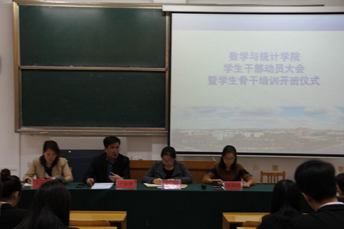 为进一步提高我院学生干部素质,增强自我教育、自我管理、自我服务的意识,切实提高工作能力和工作效率,数学与统计学院于11月9日下午在15号教学楼103教室召开学生干部动员大会暨学生骨干培训开班仪式。出席此次大会的有数学与统计学院党总支副书记王仲孝,团总支书记、学工办主任王婷及学工办全体辅导员老师。学生会全体成员及16、17级各班班长、团支书参加了此次大会,会议由张丽姣主持。