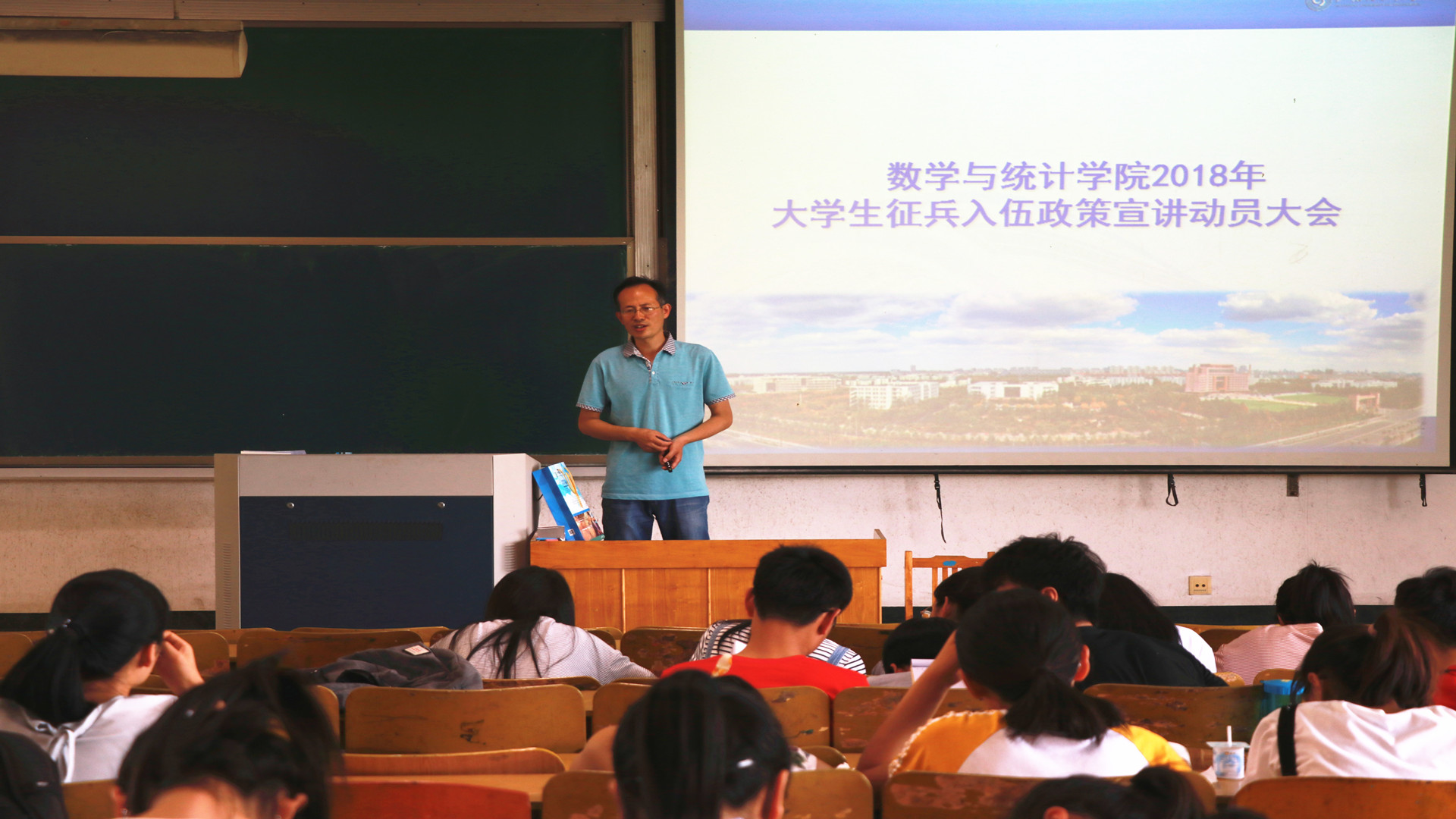 为深入贯彻全国大学生征兵工作会议精神,做好2018年大学生征兵宣传教育工作,帮助在校学生了解今年的征兵政策,激发广大学生参军入伍积极性,数学与统计学院于5月14日下午在103教室召开征兵入伍政策宣讲动员大会。会议由学工办辅导员王超老师主持,我院14级毕业生参加此次会议。