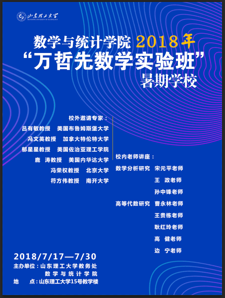 本次暑期学校我们有幸邀请到了南开大学符方伟教授、美国布鲁姆斯堡大学吕有敏教授、加拿大特伦特大学冯文英教授、美国佐治亚理工学院郁星星教授、美国内华达大学教授,山东理工大学特聘教授鹿涛、北京大学冯荣权教授等前来讲学。本次暑期学校为期两周,分为短期课程、专题报告、专业基础提升、座谈、专题讨论、素质拓展等环节,希望通过本次活动有力提升实验班的整体水平。