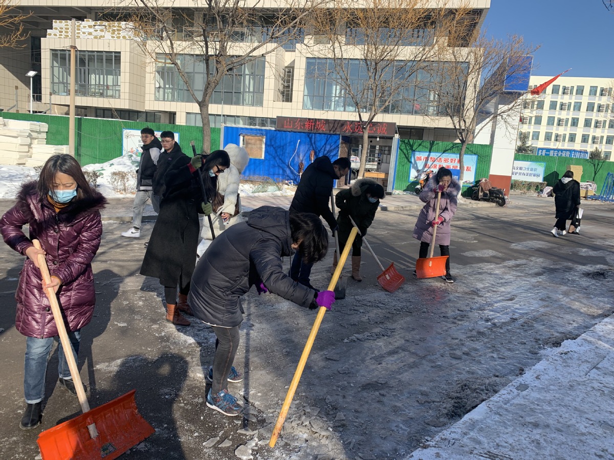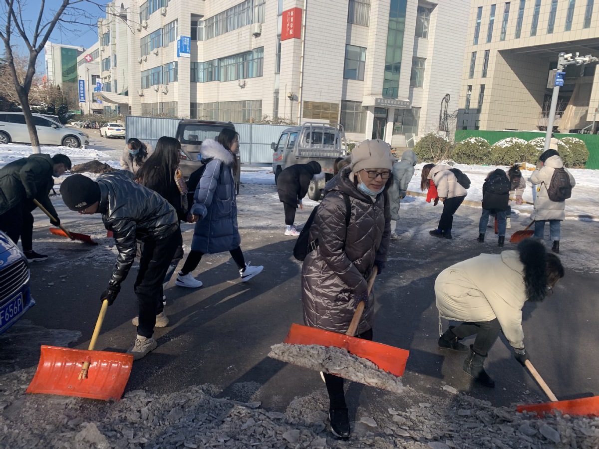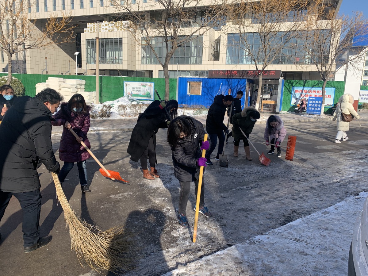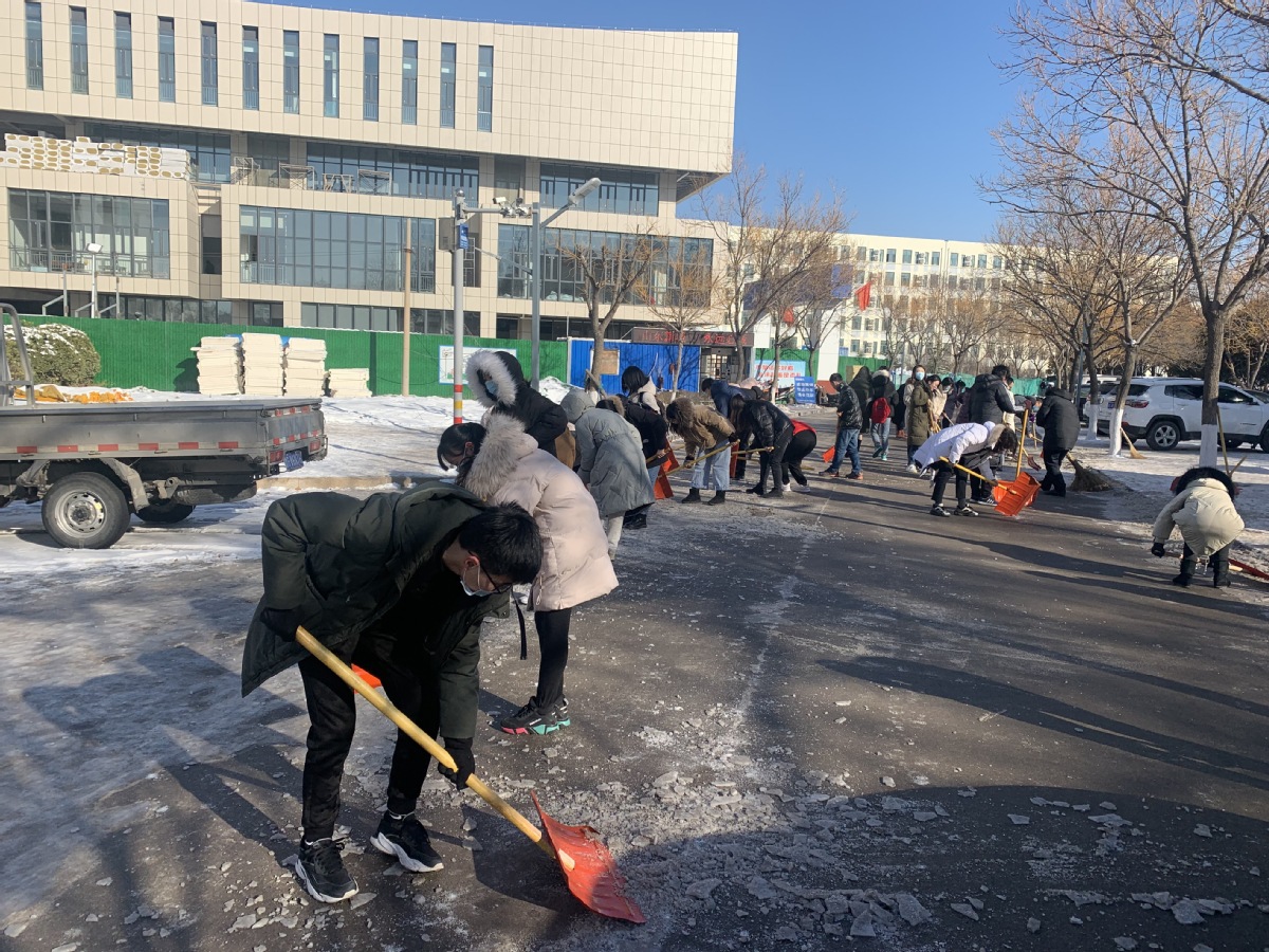 行动中,师生党员们积极到达集合地点参加铲雪除冰行动,每个人都自觉拿起铁锹干得热火朝天,两小时齐心协力的共同劳动,集中清除了绿岛西路路段至艺术中心北路口的整个路段,道路通行的安全度得到显著提高。