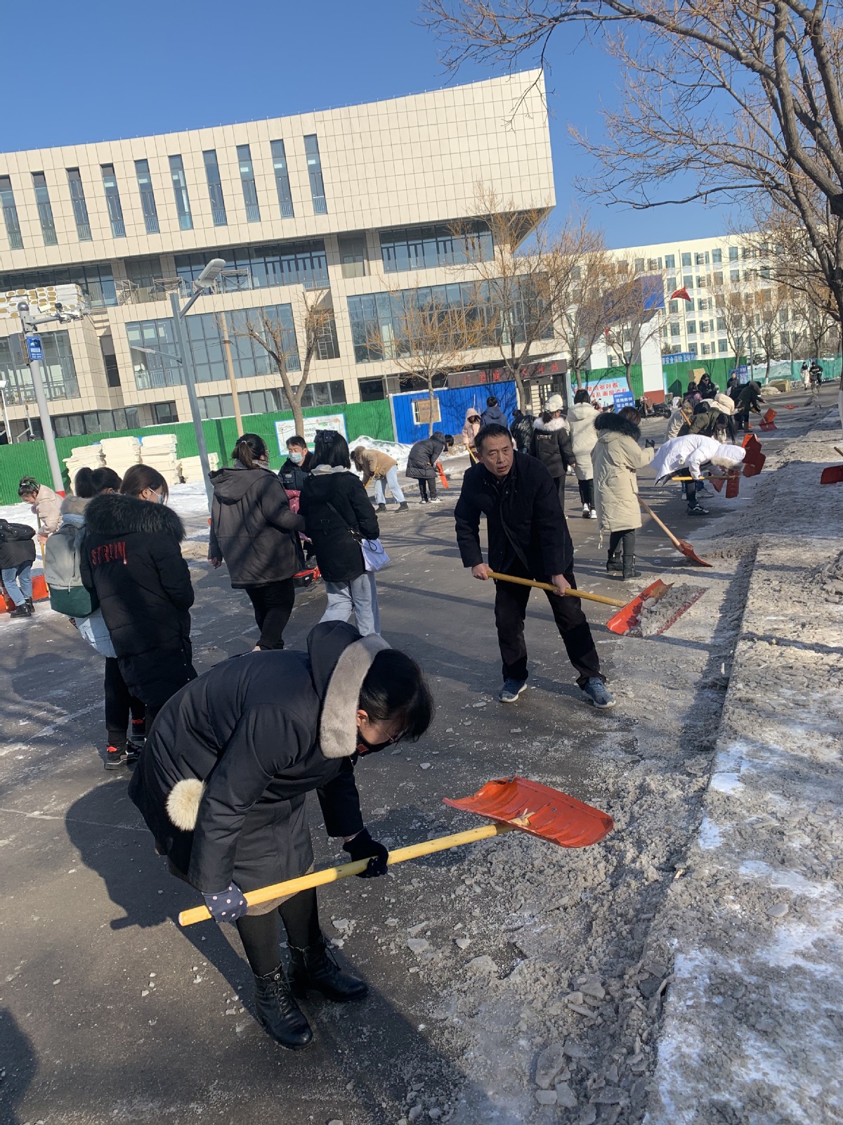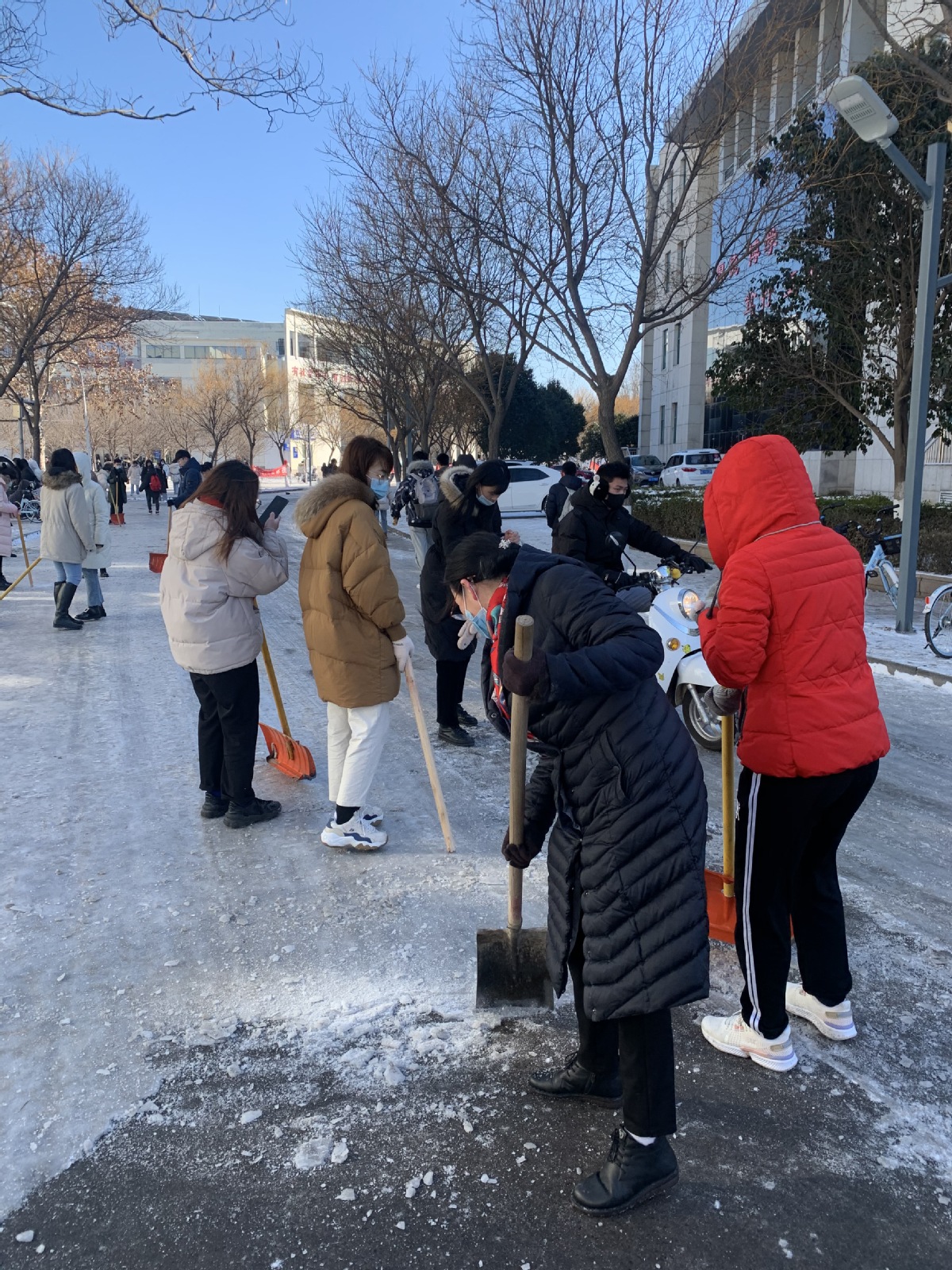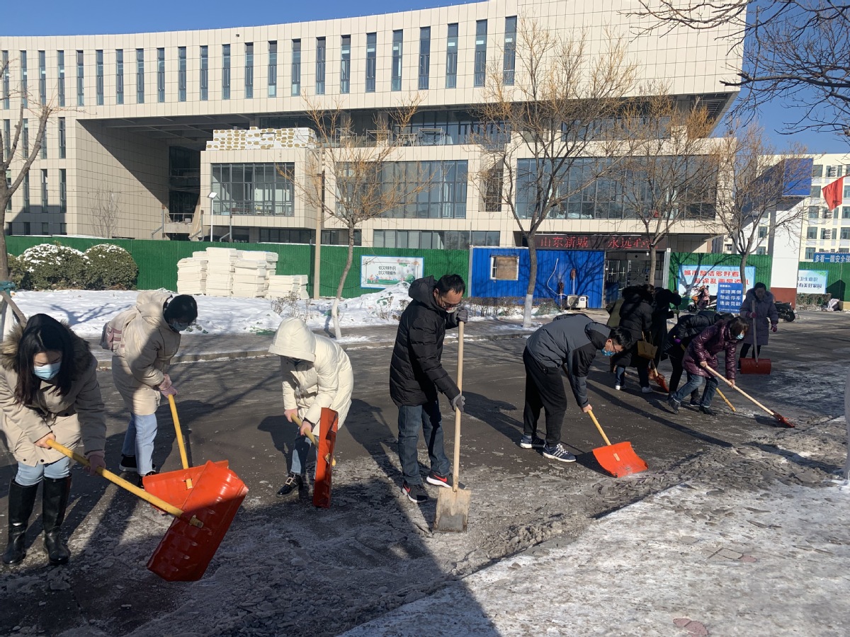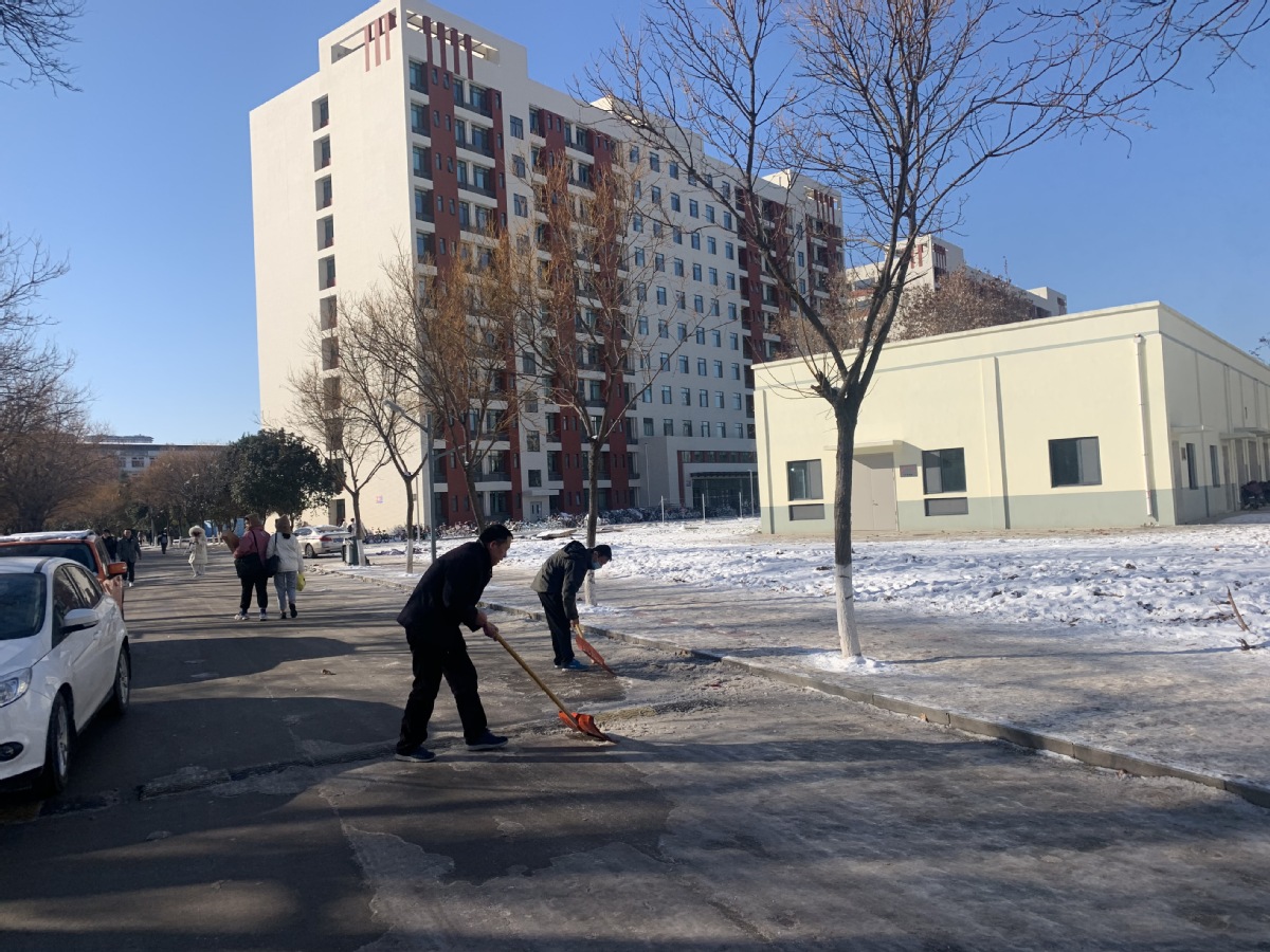 行动中,师生党员们积极到达集合地点参加铲雪除冰行动,每个人都自觉拿起铁锹干得热火朝天,两小时齐心协力的共同劳动,集中清除了绿岛西路路段至艺术中心北路口的整个路段,道路通行的安全度得到显著提高。