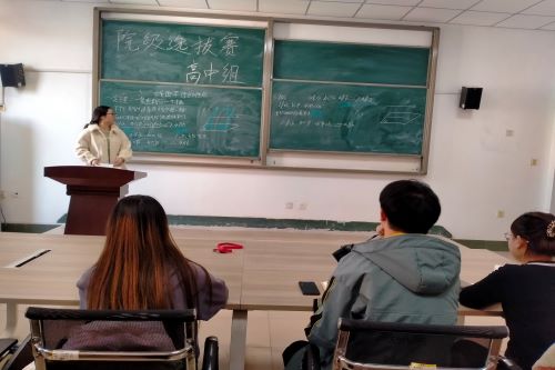 本次院级选拔赛分初赛和决赛。初赛阶段按初中组、高中组、小学组的顺序依次进行。评委由两个班级部分学生代表组成。参赛选手从相关学段题库中任选一个题目进行模拟上课,自行进行教学设计,要突出新课程教学理念,展示驾驭课堂教学艺术,体现创新精神和课堂教学研究能力。时间控制在十分钟以内,以黑板板书进行辅助,不使用PPT。