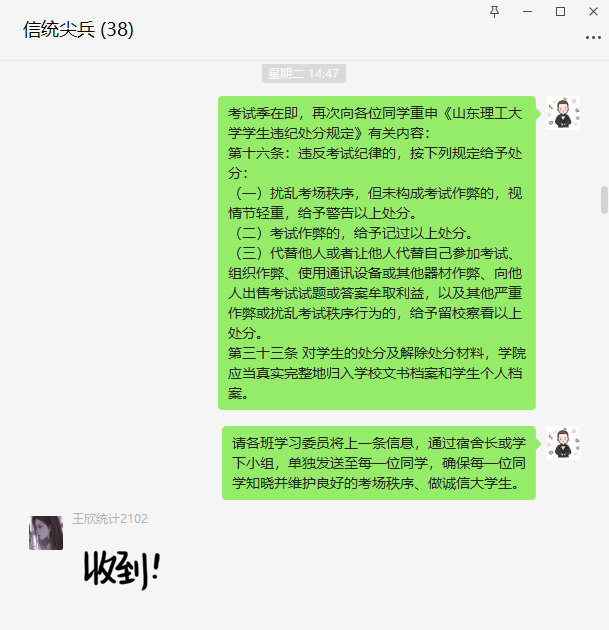 学院通过开展警示案例主题教育班会、点对点推送诚信应考提醒、组织学习学校《课程考试管理工作实施细则》《学生违纪处分条例》《学生考试纪律和违纪违规认定处理办法》等相关制度文件、开展学业帮扶等方式,持续加强校规校纪教育、诚信考试教育和违纪案例警示教育,让学生明白考试违纪的“高昂成本”和“严重后果”,消除学生侥幸心理,引导学生认真复习备考,切实提高学生的纪律意识和诚信应考意识。